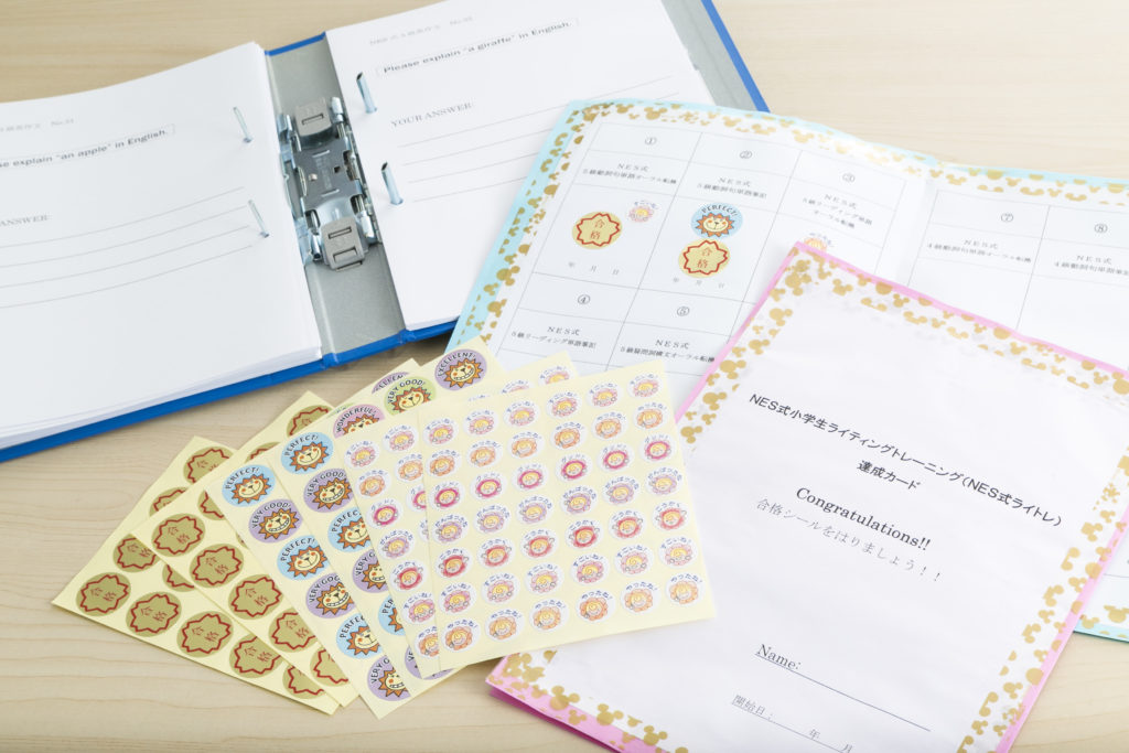 「NES式ライトレ」とは「ライティング力」と「スピーキング力」を幼児、小学生低学年でも無理なく高めていくためのトレーニングシステムです。生徒たちはタイムを競い合うことが大好きです。テストに合格すれば「合格シール」がもらえます。ゲーム感覚で「合格シール」を”Get!”していくうちに、自然に話せるようになり、書けるようにもなっていきます。