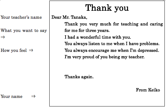 お世話になった担任の先生や英語の先生に英語でお礼状を書いてみませんか。あっという間に卒業式、3学期も終了となりますから今から準備しておきましょう。